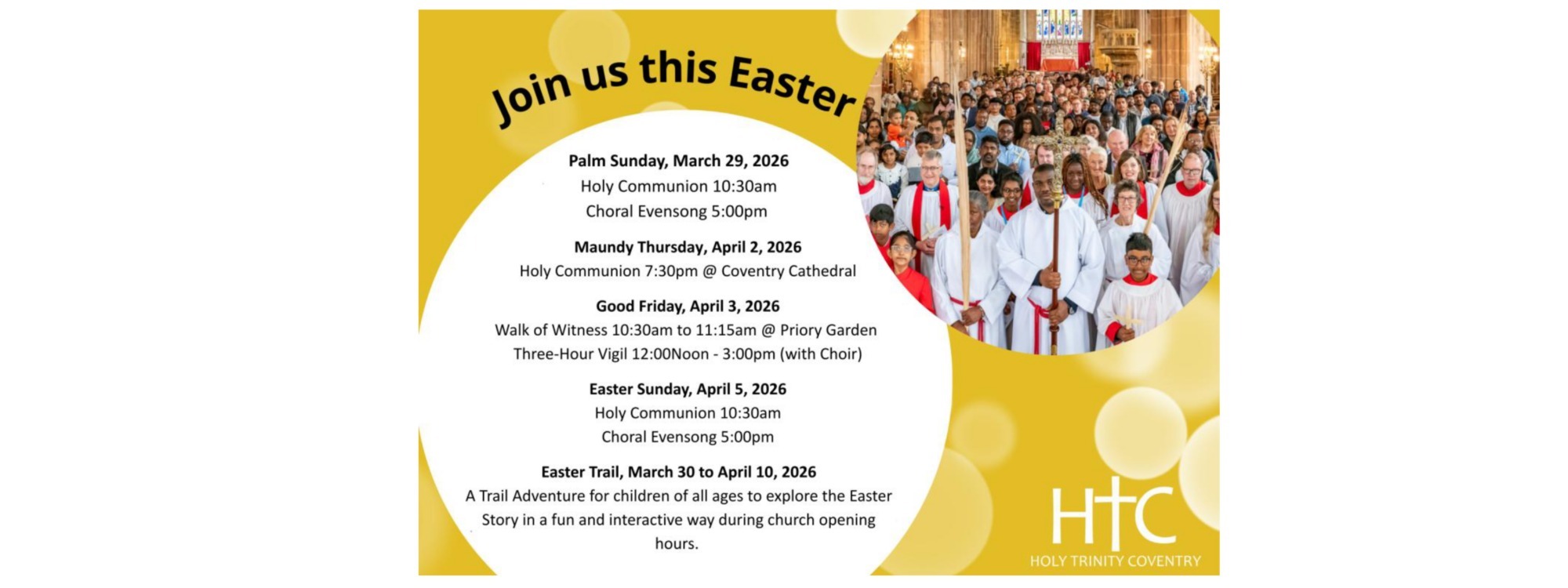 Over summer holiday periods and at special times, like Easter, Harvest and Christmas, we often change our Sunday services to bring the two main morning congregations (9.30am and 11.15am) together at 10.30am.